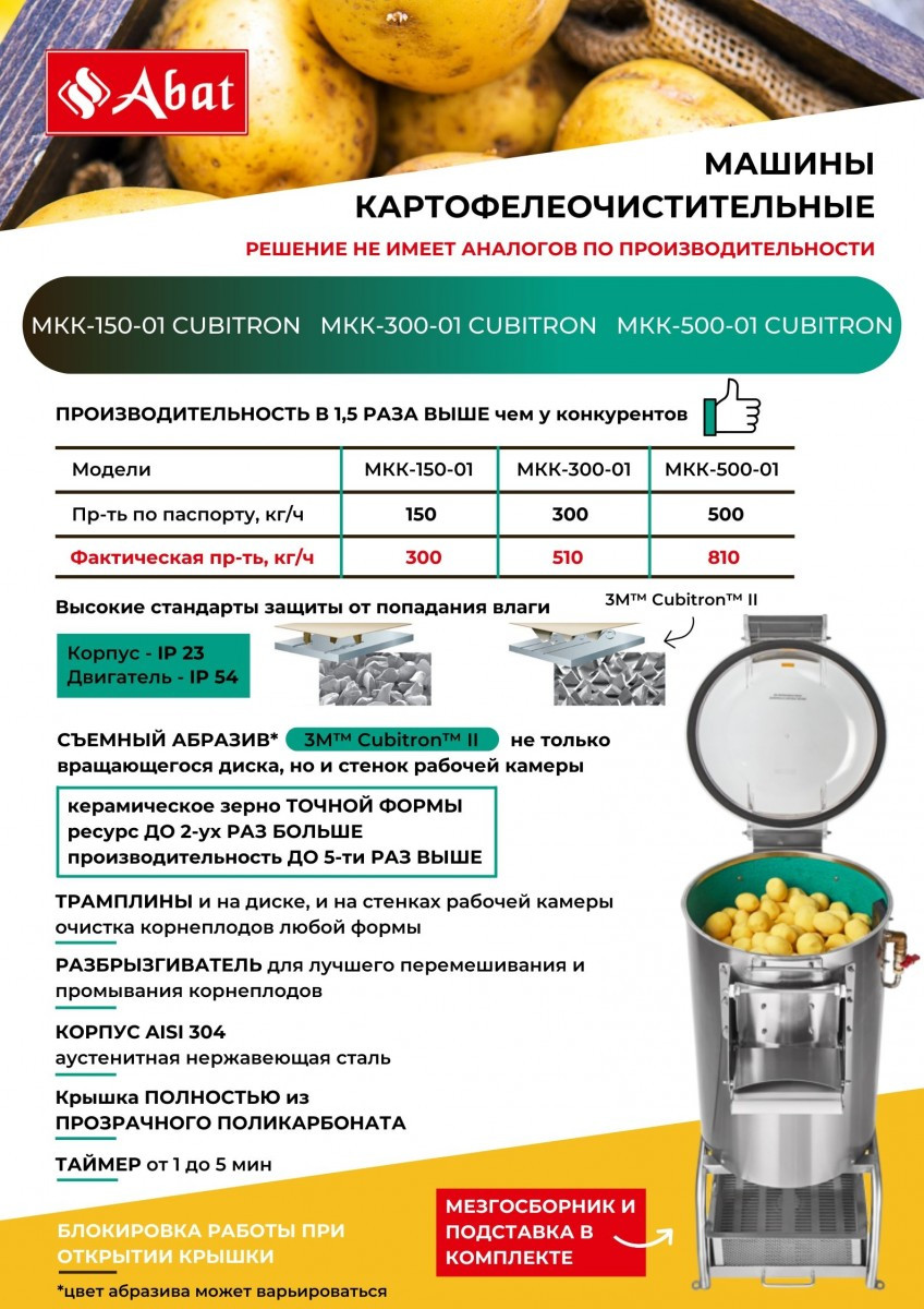 Картофелечистка Абат МКК 500 01 Cubitron-3M предназначена для очистки картофеля и корнеплодов от кожуры на предприятиях общественного питания. Корпус машины выполнен из высококачественной полированной нержавеющей стали – как снаружи, так и внутри. Мощный двигатель закрытого типа, полностью защищен от попадания влаги. Крышка из прозрачного поликарбоната позволяет наблюдать за процессом очистки. Картофелечистки серии Cubitron-3M имеют более высокий ресурс абразивной поверхности, который до 2-х раз превышает ресурс абразива стандартной комплектации. Выгрузка корнеплодов осуществляется за счет центробежной силы. Прибор имеет максимальную разовую загрузку 27 кг и максимальную производительность 500 кг/ч.