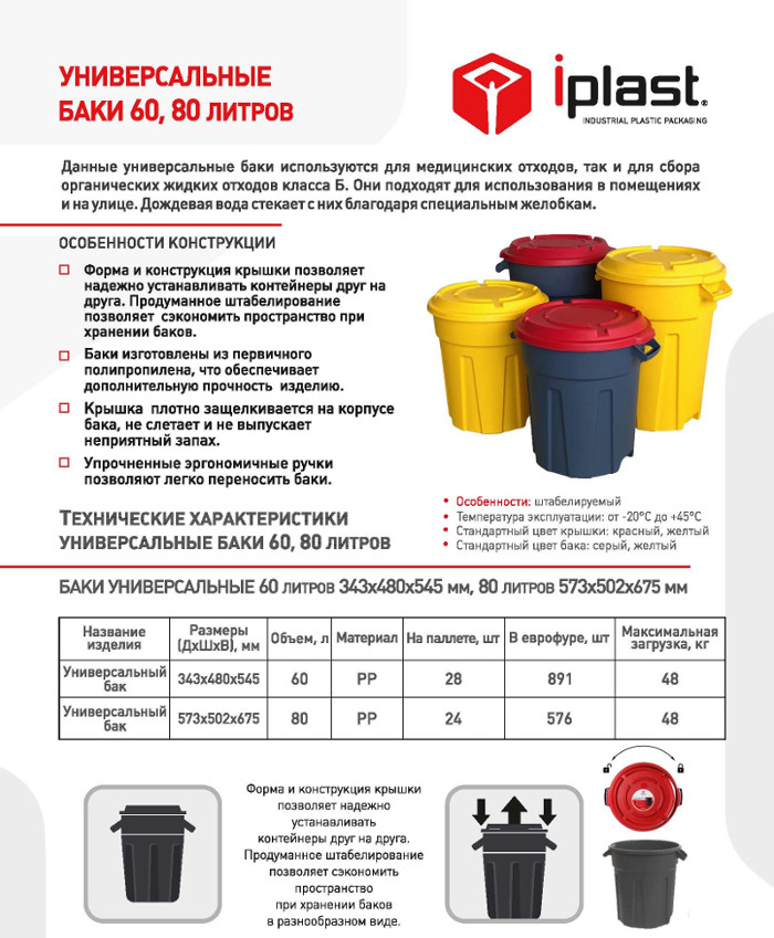 Бак универсальный Plast объемом 60 литров может применяться как для хранения воды и пищевых продуктов, так и для сбора мусора и бытовых отходов. Подходит для использования в помещениях и на улице. Имеет небольшой вес и не подвержен коррозии. Изготовлен из первичного полиэтилена, что делает его высокопрочным и позволяет использовать при широком диапазоне температур от -20 до +45°С. Контейнер имеет размеры 543x480x545 мм. Оснащен плотно прилегающей крышкой, которая защелкивается на корпусе бака, не слетает и не выпускает неприятный запах. Прочные эргономичные ручки позволяют легко переносить контейнер. Форма и конструкция крышки позволяет надежно устанавливать баки друг на друга. Цвет желтый.