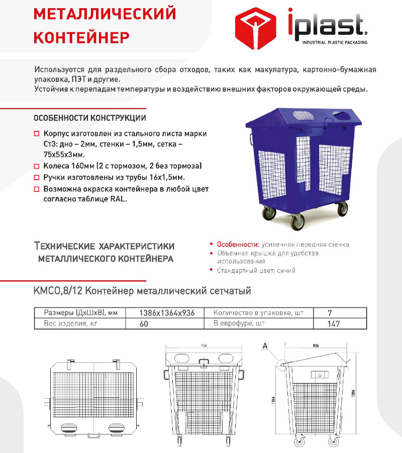 Сетчатый металлический контейнер Plast объемом 800 литров используется для раздельного сбора отходов таких как пластик, макулатура, картонно-бумажная упаковка, ПЭТ и другие. Отлично подойдет для установки как во дворах, так и на предприятиях. Выполнен из стального листа толщиной 1,5-2 мм. Подходит для эксплуатации на открытом воздухе, так как устойчив к перепадам температур и воздействию внешних факторов окружающей среды. Оснащен 4 колесиками диаметром 160 мм, 2 из которых с тормозом. Контейнер имеет усиленную переднюю стенку и объемную крышку для удобства использования. Стандартный цвет синий, но также возможна покраска в любой цвет по RAL.