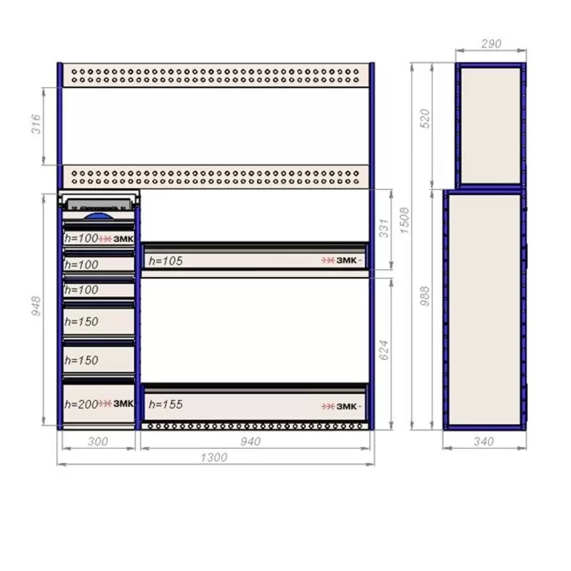 Комплект ЗМК 10.16.1508.1300.340 предназначен для комплексного оснащения сервисных автомобилей системой хранения инструмента с целью осуществления выездного сервиса, монтажа или ремонта. Используется в организациях, занимающихся ремонтом сельскохозяйственной и погрузочной техники, дорожно-ремонтных служб и других. Все элементы стеллажей изготовлены из высококачественной стали толщиной 1 мм. Рамы из профильной стальной трубы квадратного сечения 20х20 мм имеют порошковое полимерное покрытие синего цвета. Все выдвижные ящики, дверные блоки и откидные крышки оснащены специальными фиксаторами, которые не позволяют им выдвигаться и открываться при движении автомобиля. Шаг отверстий для крепления составляет 52 мм. Перфорированные стенки стеллажа позволяют фиксировать с помощью резиновых креплений вспомогательный инструмент или оборудование. Допустимая нагрузка на все ящики до 25 кг, на все полки до 50 кг, на столешницы до 100 кг. В комплект стеллажа входят все необходимые метизы, фиксаторы, кронштейны и усилители. Они поставляются в разобранном виде в надежной упаковке.
