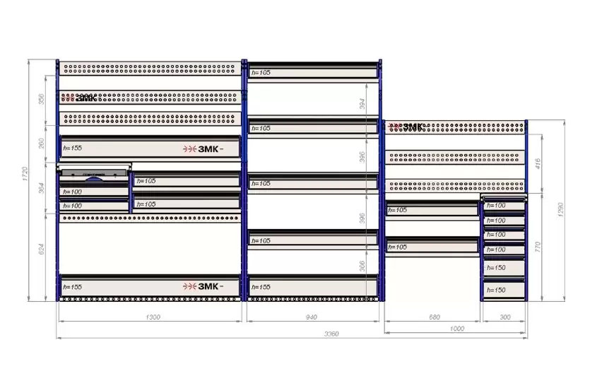 Комплект ЗМК 10.3.1720.3360.440 предназначен для комплексного оснащения сервисных автомобилей системой хранения инструмента с целью осуществления выездного сервиса, монтажа или ремонта. Используется в организациях, занимающихся ремонтом сельскохозяйственной и погрузочной техники, дорожно-ремонтных служб и других. Все элементы стеллажей изготовлены из высококачественной стали толщиной 1 мм. Рамы из профильной стальной трубы квадратного сечения 20х20 мм имеют порошковое полимерное покрытие синего цвета. Все выдвижные ящики, дверные блоки и откидные крышки оснащены специальными фиксаторами, которые не позволяют им выдвигаться и открываться при движении автомобиля. Шаг отверстий для крепления составляет 52 мм. Перфорированные стенки стеллажа позволяют фиксировать с помощью резиновых креплений вспомогательный инструмент или оборудование. Допустимая нагрузка на все ящики до 35 кг, на все полки до 50 кг, на столешницы до 100 кг. В комплект стеллажа входят все необходимые метизы, фиксаторы, кронштейны и усилители. Они поставляются в разобранном виде в надежной упаковке.