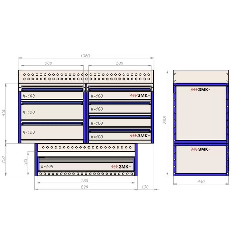 Комплект ЗМК 11.4.808.1080.440 предназначен для комплексного оснащения сервисных автомобилей системой хранения инструмента с целью осуществления выездного сервиса, монтажа или ремонта. Используется в организациях, занимающихся ремонтом сельскохозяйственной и погрузочной техники, дорожно-ремонтных служб и других. Все элементы стеллажей изготовлены из высококачественной стали толщиной 1 мм. Рамы из профильной стальной трубы квадратного сечения 20х20 мм имеют порошковое полимерное покрытие синего цвета. Все выдвижные ящики, дверные блоки и откидные крышки оснащены специальными фиксаторами, которые не позволяют им выдвигаться и открываться при движении автомобиля. Шаг отверстий для крепления составляет 52 мм. Перфорированные стенки стеллажа позволяют фиксировать с помощью резиновых креплений вспомогательный инструмент или оборудование. Допустимая нагрузка на все ящики до 35 кг, на все полки до 50 кг, на столешницы до 100 кг. В комплект стеллажа входят все необходимые метизы, фиксаторы, кронштейны и усилители. Они поставляются в разобранном виде в надежной упаковке.
