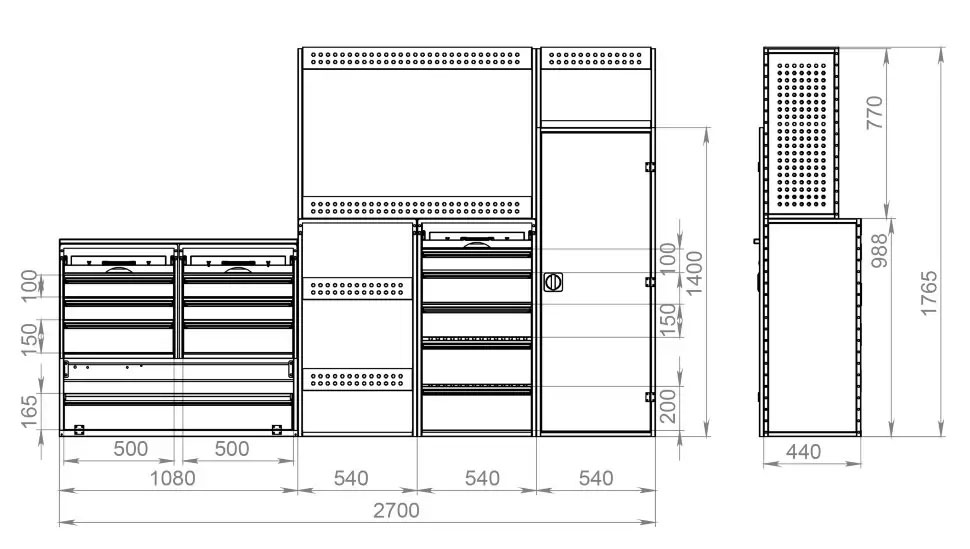 Комплект ЗМК 13.22.1756.2700.485 предназначен для комплексного оснащения сервисных автомобилей системой хранения инструмента с целью осуществления выездного сервиса, монтажа или ремонта. Используется в организациях, занимающихся ремонтом сельскохозяйственной и погрузочной техники, дорожно-ремонтных служб и других. Все элементы стеллажей изготовлены из высококачественной стали толщиной 1 мм. Рамы из профильной стальной трубы квадратного сечения 20х20 мм имеют порошковое полимерное покрытие синего цвета. Все выдвижные ящики, дверные блоки и откидные крышки оснащены специальными фиксаторами, которые не позволяют им выдвигаться и открываться при движении автомобиля. Шаг отверстий для крепления составляет 52 мм. Перфорированные стенки стеллажа позволяют фиксировать с помощью резиновых креплений вспомогательный инструмент или оборудование. Допустимая нагрузка на все ящики до 35 кг, на все полки до 50 кг, на столешницы до 100 кг. В комплект стеллажа входят все необходимые метизы, фиксаторы, кронштейны и усилители. Они поставляются в разобранном виде в надежной упаковке.