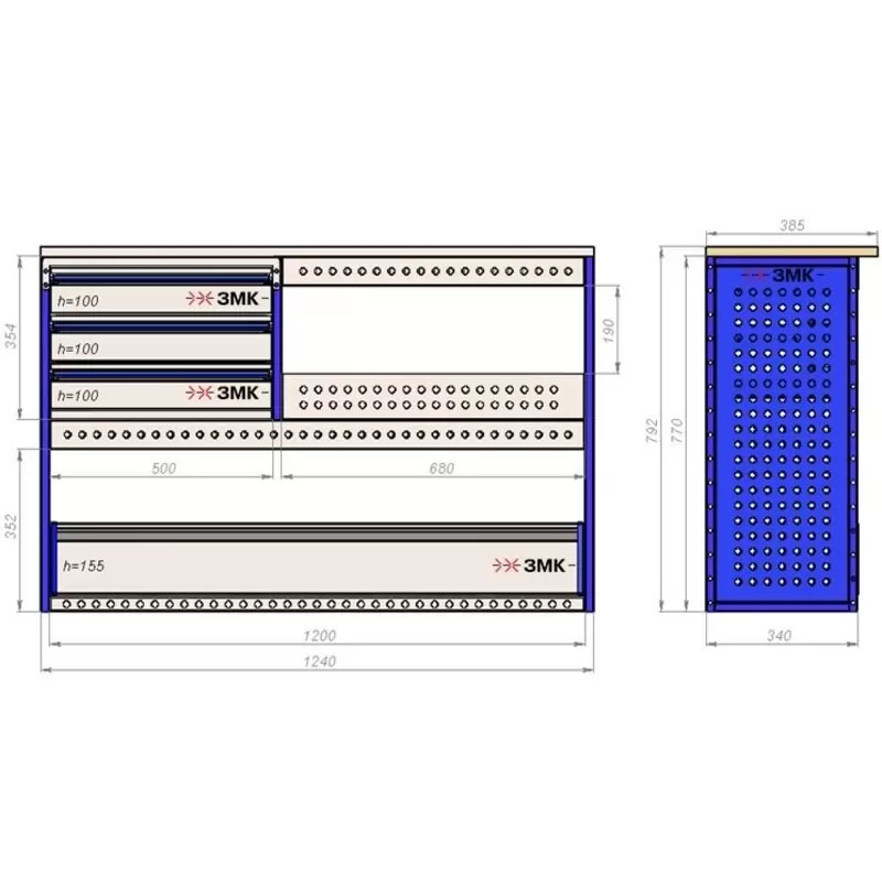 Комплект ЗМК 13.31.792.1240.385 предназначен для комплексного оснащения сервисных автомобилей системой хранения инструмента с целью осуществления выездного сервиса, монтажа или ремонта. Используется в организациях, занимающихся ремонтом сельскохозяйственной и погрузочной техники, дорожно-ремонтных служб и других. Все элементы стеллажей изготовлены из высококачественной стали толщиной 1 мм. Рамы из профильной стальной трубы квадратного сечения 20х20 мм имеют порошковое полимерное покрытие синего цвета. Все выдвижные ящики, дверные блоки и откидные крышки оснащены специальными фиксаторами, которые не позволяют им выдвигаться и открываться при движении автомобиля. Шаг отверстий для крепления составляет 52 мм. Перфорированные стенки стеллажа позволяют фиксировать с помощью резиновых креплений вспомогательный инструмент или оборудование. Допустимая нагрузка на все ящики до 35 кг, на все полки до 50 кг, на столешницы до 100 кг. В комплект стеллажа входят все необходимые метизы, фиксаторы, кронштейны и усилители. Они поставляются в разобранном виде в надежной упаковке.