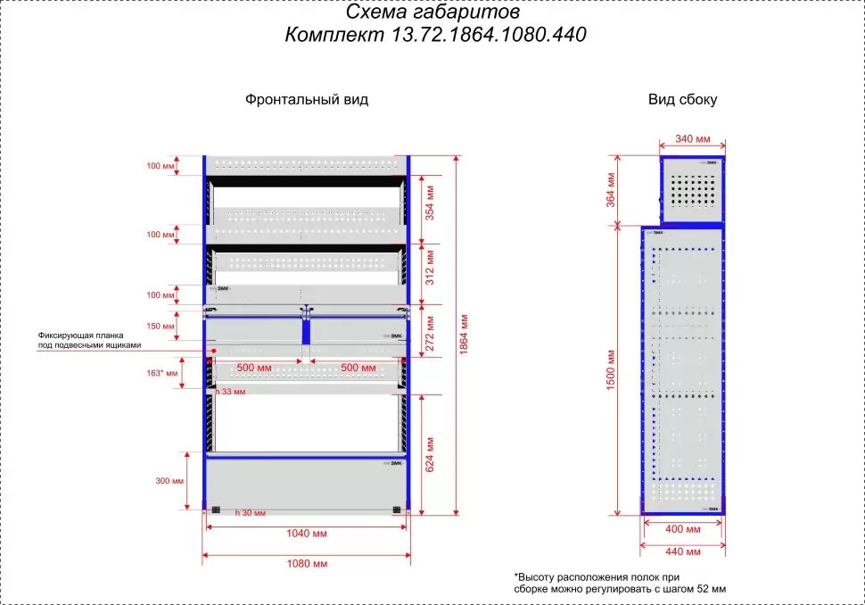Комплект ЗМК 13.72.1864.1080.440 предназначен для комплексного оснащения сервисных автомобилей системой хранения инструмента с целью осуществления выездного сервиса, монтажа или ремонта. Используется в организациях, занимающихся ремонтом сельскохозяйственной и погрузочной техники, дорожно-ремонтных служб и других. Все элементы стеллажей изготовлены из высококачественной стали толщиной 1 мм. Рамы из профильной стальной трубы квадратного сечения 20х20 мм имеют порошковое полимерное покрытие синего цвета. Все выдвижные ящики, дверные блоки и откидные крышки оснащены специальными фиксаторами, которые не позволяют им выдвигаться и открываться при движении автомобиля. Шаг отверстий для крепления составляет 52 мм. Перфорированные стенки стеллажа позволяют фиксировать с помощью резиновых креплений вспомогательный инструмент или оборудование. Допустимая нагрузка на все ящики до 35 кг, на все полки до 50 кг, на столешницы до 100 кг. В комплект стеллажа входят все необходимые метизы, фиксаторы, кронштейны и усилители. Они поставляются в разобранном виде в надежной упаковке.