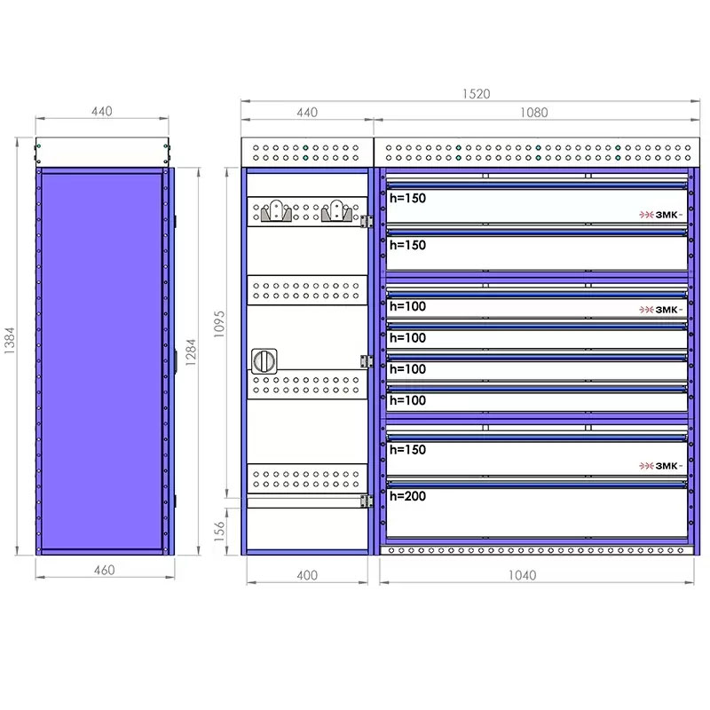 Комплект ЗМК 13.91.1384.1520.460 предназначен для комплексного оснащения сервисных автомобилей системой хранения инструмента с целью осуществления выездного сервиса, монтажа или ремонта. Используется в организациях, занимающихся ремонтом сельскохозяйственной и погрузочной техники, дорожно-ремонтных служб и других. Все элементы стеллажей изготовлены из высококачественной стали толщиной 1 мм. Рамы из профильной стальной трубы квадратного сечения 20х20 мм имеют порошковое полимерное покрытие синего цвета. Все выдвижные ящики, дверные блоки и откидные крышки оснащены специальными фиксаторами, которые не позволяют им выдвигаться и открываться при движении автомобиля. Шаг отверстий для крепления составляет 52 мм. Перфорированные стенки стеллажа позволяют фиксировать с помощью резиновых креплений вспомогательный инструмент или оборудование. Допустимая нагрузка на все ящики до 35 кг, на все полки до 50 кг, на столешницы до 100 кг. В комплект стеллажа входят все необходимые метизы, фиксаторы, кронштейны и усилители. Они поставляются в разобранном виде в надежной упаковке.