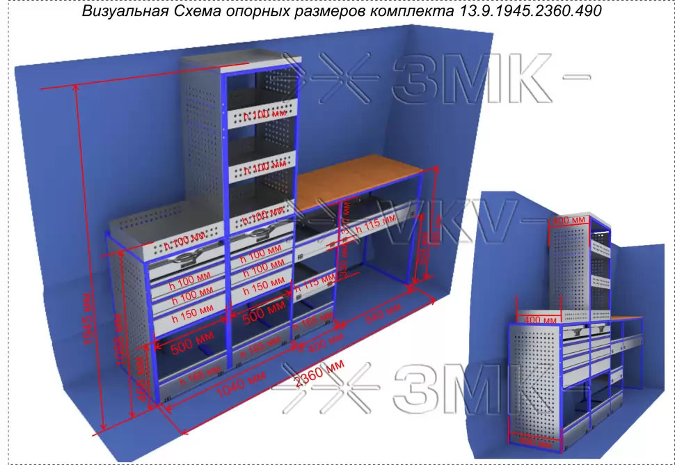 Комплект ЗМК 13.9.1945.2360.490 предназначен для комплексного оснащения сервисных автомобилей системой хранения инструмента с целью осуществления выездного сервиса, монтажа или ремонта. Используется в организациях, занимающихся ремонтом сельскохозяйственной и погрузочной техники, дорожно-ремонтных служб и других. Все элементы стеллажей изготовлены из высококачественной стали толщиной 1 мм. Рамы из профильной стальной трубы квадратного сечения 20х20 мм имеют порошковое полимерное покрытие синего цвета. Все выдвижные ящики, дверные блоки и откидные крышки оснащены специальными фиксаторами, которые не позволяют им выдвигаться и открываться при движении автомобиля. Шаг отверстий для крепления составляет 52 мм. Перфорированные стенки стеллажа позволяют фиксировать с помощью резиновых креплений вспомогательный инструмент или оборудование. Допустимая нагрузка на все ящики до 35 кг, на все полки до 50 кг, на столешницы до 100 кг. В комплект стеллажа входят все необходимые метизы, фиксаторы, кронштейны и усилители. Они поставляются в разобранном виде в надежной упаковке.