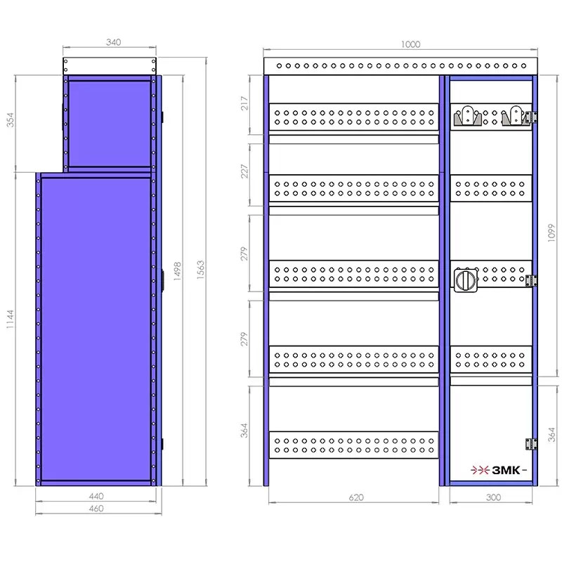 Комплект ЗМК 14.10.1563.1000.460 предназначен для комплексного оснащения сервисных автомобилей системой хранения инструмента с целью осуществления выездного сервиса, монтажа или ремонта. Используется в организациях, занимающихся ремонтом сельскохозяйственной и погрузочной техники, дорожно-ремонтных служб и других. Все элементы стеллажей изготовлены из высококачественной стали толщиной 1 мм. Рамы из профильной стальной трубы квадратного сечения 20х20 мм имеют порошковое полимерное покрытие синего цвета. Все выдвижные ящики, дверные блоки и откидные крышки оснащены специальными фиксаторами, которые не позволяют им выдвигаться и открываться при движении автомобиля. Шаг отверстий для крепления составляет 52 мм. Перфорированные стенки стеллажа позволяют фиксировать с помощью резиновых креплений вспомогательный инструмент или оборудование. Допустимая нагрузка на все ящики до 35 кг, на все полки до 50 кг, на столешницы до 100 кг. В комплект стеллажа входят все необходимые метизы, фиксаторы, кронштейны и усилители. Они поставляются в разобранном виде в надежной упаковке.