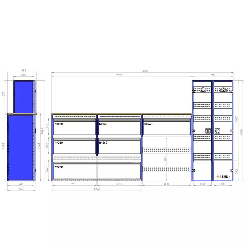 Комплект ЗМК 14.11.1664.3000.460 предназначен для комплексного оснащения сервисных автомобилей системой хранения инструмента с целью осуществления выездного сервиса, монтажа или ремонта. Используется в организациях, занимающихся ремонтом сельскохозяйственной и погрузочной техники, дорожно-ремонтных служб и других. Все элементы стеллажей изготовлены из высококачественной стали толщиной 1 мм. Рамы из профильной стальной трубы квадратного сечения 20х20 мм имеют порошковое полимерное покрытие синего цвета. Все выдвижные ящики, дверные блоки и откидные крышки оснащены специальными фиксаторами, которые не позволяют им выдвигаться и открываться при движении автомобиля. Шаг отверстий для крепления составляет 52 мм. Перфорированные стенки стеллажа позволяют фиксировать с помощью резиновых креплений вспомогательный инструмент или оборудование. Допустимая нагрузка на все ящики до 35 кг, на все полки до 50 кг, на столешницы до 100 кг. В комплект стеллажа входят все необходимые метизы, фиксаторы, кронштейны и усилители. Они поставляются в разобранном виде в надежной упаковке.