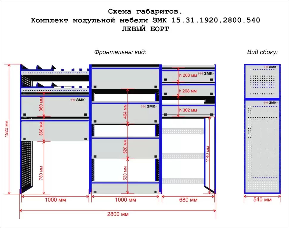 Комплект ЗМК 15.31.1920.2800.460 предназначен для комплексного оснащения сервисных автомобилей системой хранения инструмента с целью осуществления выездного сервиса, монтажа или ремонта. Используется в организациях, занимающихся ремонтом сельскохозяйственной и погрузочной техники, дорожно-ремонтных служб и других. Все элементы стеллажей изготовлены из высококачественной стали толщиной 1 мм. Рамы из профильной стальной трубы квадратного сечения 20х20 мм имеют порошковое полимерное покрытие синего цвета. Все выдвижные ящики, дверные блоки и откидные крышки оснащены специальными фиксаторами, которые не позволяют им выдвигаться и открываться при движении автомобиля. Шаг отверстий для крепления составляет 52 мм. Перфорированные стенки стеллажа позволяют фиксировать с помощью резиновых креплений вспомогательный инструмент или оборудование. Допустимая нагрузка на все ящики до 35 кг, на все полки до 50 кг, на столешницы до 100 кг. В комплект стеллажа входят все необходимые метизы, фиксаторы, кронштейны и усилители. Они поставляются в разобранном виде в надежной упаковке.