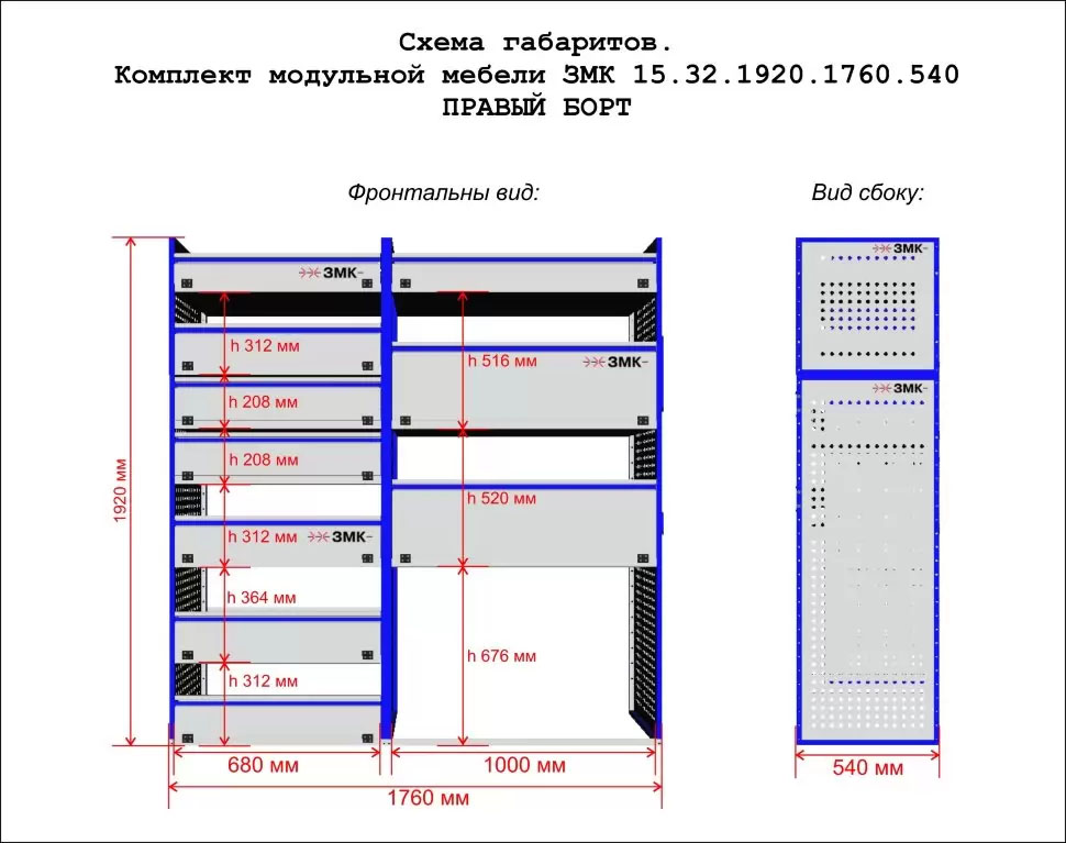Комплект ЗМК 15.32.1920.1760.540 предназначен для комплексного оснащения сервисных автомобилей системой хранения инструмента с целью осуществления выездного сервиса, монтажа или ремонта. Используется в организациях, занимающихся ремонтом сельскохозяйственной и погрузочной техники, дорожно-ремонтных служб и других. Все элементы стеллажей изготовлены из высококачественной стали толщиной 1 мм. Рамы из профильной стальной трубы квадратного сечения 20х20 мм имеют порошковое полимерное покрытие синего цвета. Все выдвижные ящики, дверные блоки и откидные крышки оснащены специальными фиксаторами, которые не позволяют им выдвигаться и открываться при движении автомобиля. Шаг отверстий для крепления составляет 52 мм. Перфорированные стенки стеллажа позволяют фиксировать с помощью резиновых креплений вспомогательный инструмент или оборудование. Допустимая нагрузка на все ящики до 35 кг, на все полки до 50 кг, на столешницы до 100 кг. В комплект стеллажа входят все необходимые метизы, фиксаторы, кронштейны и усилители. Они поставляются в разобранном виде в надежной упаковке.