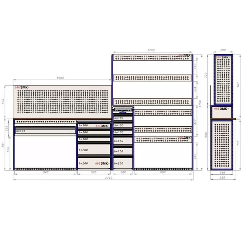 Комплект ЗМК 1.3.1760.2740.385 предназначен для комплексного оснащения сервисных автомобилей системой хранения инструмента с целью осуществления выездного сервиса, монтажа или ремонта. Используется в организациях, занимающихся ремонтом сельскохозяйственной и погрузочной техники, дорожно-ремонтных служб и других. Все элементы стеллажей изготовлены из высококачественной стали толщиной 1 мм. Рамы из профильной стальной трубы квадратного сечения 20х20 мм имеют порошковое полимерное покрытие синего цвета. Все выдвижные ящики, дверные блоки и откидные крышки оснащены специальными фиксаторами, которые не позволяют им выдвигаться и открываться при движении автомобиля. Шаг отверстий для крепления составляет 52 мм. Перфорированные стенки стеллажа позволяют фиксировать с помощью резиновых креплений вспомогательный инструмент или оборудование. Допустимая нагрузка на все ящики до 35 кг, на все полки до 50 кг, на столешницы до 100 кг. В комплект стеллажа входят все необходимые метизы, фиксаторы, кронштейны и усилители. Они поставляются в разобранном виде в надежной упаковке.