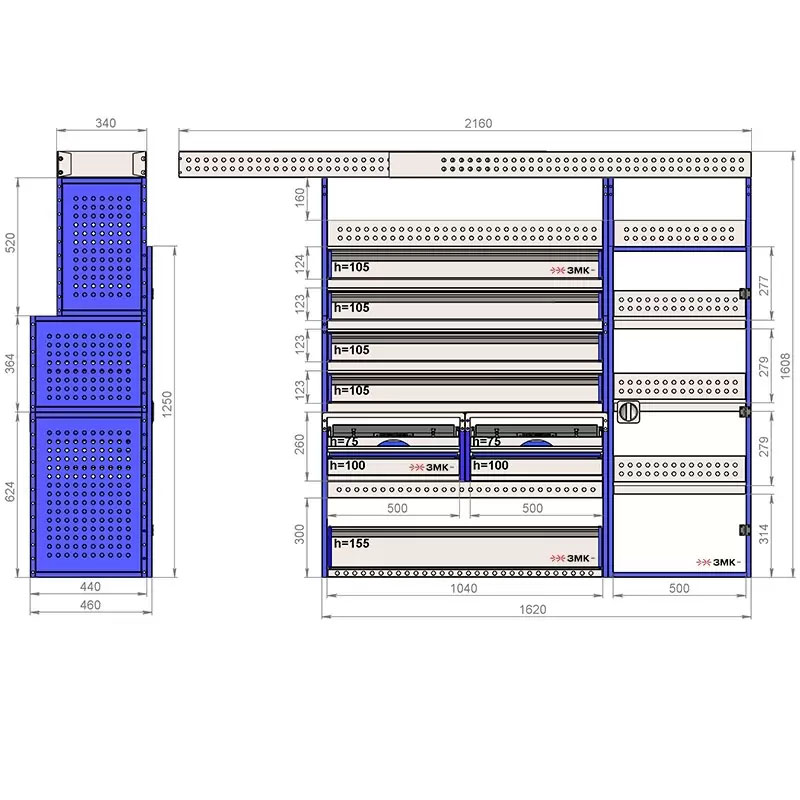 Комплект ЗМК 3.12.1608.2160.460 предназначен для комплексного оснащения сервисных автомобилей системой хранения инструмента с целью осуществления выездного сервиса, монтажа или ремонта. Используется в организациях, занимающихся ремонтом сельскохозяйственной и погрузочной техники, дорожно-ремонтных служб и других. Все элементы стеллажей изготовлены из высококачественной стали толщиной 1 мм. Рамы из профильной стальной трубы квадратного сечения 20х20 мм имеют порошковое полимерное покрытие синего цвета. Все выдвижные ящики, дверные блоки и откидные крышки оснащены специальными фиксаторами, которые не позволяют им выдвигаться и открываться при движении автомобиля. Шаг отверстий для крепления составляет 52 мм. Перфорированные стенки стеллажа позволяют фиксировать с помощью резиновых креплений вспомогательный инструмент или оборудование. Допустимая нагрузка на все ящики до 35 кг, на все полки до 50 кг, на столешницы до 100 кг. В комплект стеллажа входят все необходимые метизы, фиксаторы, кронштейны и усилители. Они поставляются в разобранном виде в надежной упаковке.