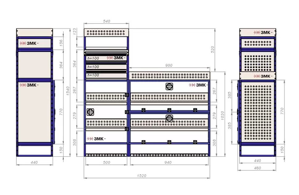 Комплект ЗМК 3.15.1540.1520.460 предназначен для комплексного оснащения сервисных автомобилей системой хранения инструмента с целью осуществления выездного сервиса, монтажа или ремонта. Используется в организациях, занимающихся ремонтом сельскохозяйственной и погрузочной техники, дорожно-ремонтных служб и других. Все элементы стеллажей изготовлены из высококачественной стали толщиной 1 мм. Рамы из профильной стальной трубы квадратного сечения 20х20 мм имеют порошковое полимерное покрытие синего цвета. Все выдвижные ящики, дверные блоки и откидные крышки оснащены специальными фиксаторами, которые не позволяют им выдвигаться и открываться при движении автомобиля. Шаг отверстий для крепления составляет 52 мм. Перфорированные стенки стеллажа позволяют фиксировать с помощью резиновых креплений вспомогательный инструмент или оборудование. Допустимая нагрузка на все ящики до 35 кг, на все полки до 50 кг, на столешницы до 100 кг. В комплект стеллажа входят все необходимые метизы, фиксаторы, кронштейны и усилители. Они поставляются в разобранном виде в надежной упаковке.