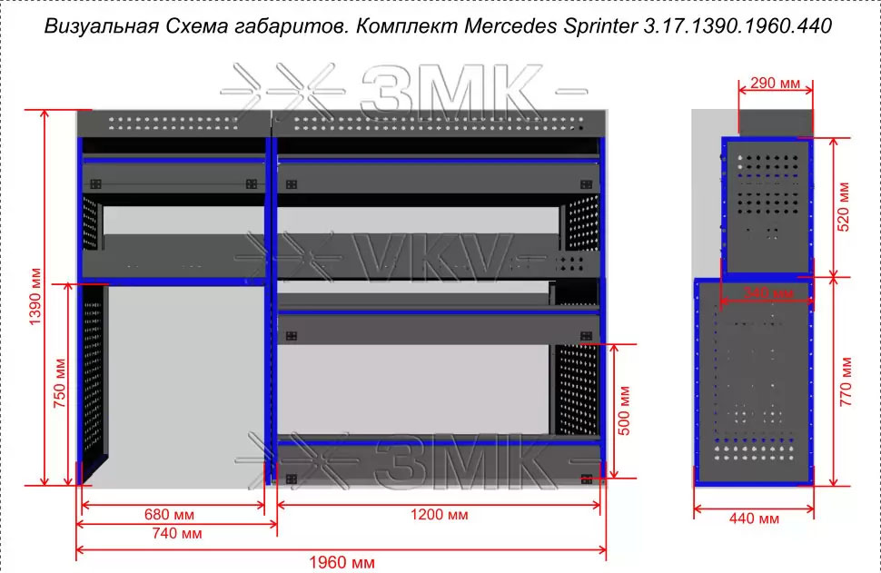 Комплект ЗМК 3.17.1390.1960.440 предназначен для комплексного оснащения сервисных автомобилей системой хранения инструмента с целью осуществления выездного сервиса, монтажа или ремонта. Используется в организациях, занимающихся ремонтом сельскохозяйственной и погрузочной техники, дорожно-ремонтных служб и других. Все элементы стеллажей изготовлены из высококачественной стали толщиной 1 мм. Рамы из профильной стальной трубы квадратного сечения 20х20 мм имеют порошковое полимерное покрытие синего цвета. Все выдвижные ящики, дверные блоки и откидные крышки оснащены специальными фиксаторами, которые не позволяют им выдвигаться и открываться при движении автомобиля. Шаг отверстий для крепления составляет 52 мм. Перфорированные стенки стеллажа позволяют фиксировать с помощью резиновых креплений вспомогательный инструмент или оборудование. Допустимая нагрузка на все ящики до 35 кг, на все полки до 50 кг, на столешницы до 100 кг. В комплект стеллажа входят все необходимые метизы, фиксаторы, кронштейны и усилители. Они поставляются в разобранном виде в надежной упаковке.