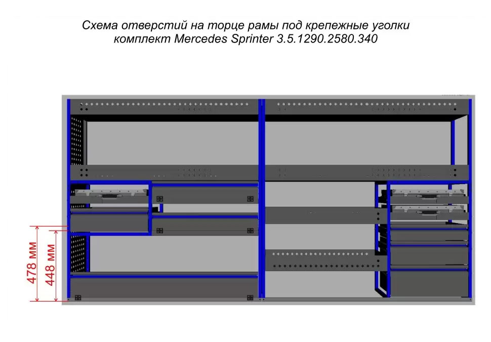 Комплект ЗМК 3.5.1290.2580.340 предназначен для комплексного оснащения сервисных автомобилей системой хранения инструмента с целью осуществления выездного сервиса, монтажа или ремонта. Используется в организациях, занимающихся ремонтом сельскохозяйственной и погрузочной техники, дорожно-ремонтных служб и других. Все элементы стеллажей изготовлены из высококачественной стали толщиной 1 мм. Рамы из профильной стальной трубы квадратного сечения 20х20 мм имеют порошковое полимерное покрытие синего цвета. Все выдвижные ящики, дверные блоки и откидные крышки оснащены специальными фиксаторами, которые не позволяют им выдвигаться и открываться при движении автомобиля. Шаг отверстий для крепления составляет 52 мм. Перфорированные стенки стеллажа позволяют фиксировать с помощью резиновых креплений вспомогательный инструмент или оборудование. Допустимая нагрузка на все ящики до 35 кг, на все полки до 50 кг, на столешницы до 100 кг. В комплект стеллажа входят все необходимые метизы, фиксаторы, кронштейны и усилители. Они поставляются в разобранном виде в надежной упаковке.