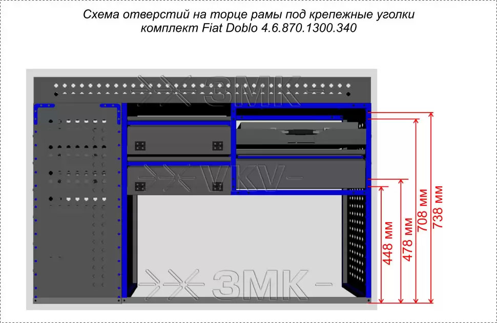 Комплект ЗМК 4.6.870.1300.340 предназначен для комплексного оснащения сервисных автомобилей системой хранения инструмента с целью осуществления выездного сервиса, монтажа или ремонта. Используется в организациях, занимающихся ремонтом сельскохозяйственной и погрузочной техники, дорожно-ремонтных служб и других. Все элементы стеллажей изготовлены из высококачественной стали толщиной 1 мм. Рамы из профильной стальной трубы квадратного сечения 20х20 мм имеют порошковое полимерное покрытие синего цвета. Все выдвижные ящики, дверные блоки и откидные крышки оснащены специальными фиксаторами, которые не позволяют им выдвигаться и открываться при движении автомобиля. Шаг отверстий для крепления составляет 52 мм. Перфорированные стенки стеллажа позволяют фиксировать с помощью резиновых креплений вспомогательный инструмент или оборудование. Допустимая нагрузка на все ящики до 35 кг, на все полки до 50 кг, на столешницы до 100 кг. В комплект стеллажа входят все необходимые метизы, фиксаторы, кронштейны и усилители. Они поставляются в разобранном виде в надежной упаковке.
