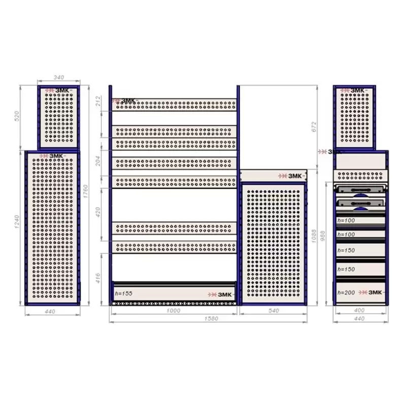 Комплект ЗМК 6.46.1760.1580.440 предназначен для комплексного оснащения сервисных автомобилей системой хранения инструмента с целью осуществления выездного сервиса, монтажа или ремонта. Используется в организациях, занимающихся ремонтом сельскохозяйственной и погрузочной техники, дорожно-ремонтных служб и других. Все элементы стеллажей изготовлены из высококачественной стали толщиной 1 мм. Рамы из профильной стальной трубы квадратного сечения 20х20 мм имеют порошковое полимерное покрытие синего цвета. Все выдвижные ящики, дверные блоки и откидные крышки оснащены специальными фиксаторами, которые не позволяют им выдвигаться и открываться при движении автомобиля. Шаг отверстий для крепления составляет 52 мм. Перфорированные стенки стеллажа позволяют фиксировать с помощью резиновых креплений вспомогательный инструмент или оборудование. Допустимая нагрузка на все ящики до 35 кг, на все полки до 50 кг, на столешницы до 100 кг. В комплект стеллажа входят все необходимые метизы, фиксаторы, кронштейны и усилители. Они поставляются в разобранном виде в надежной упаковке.