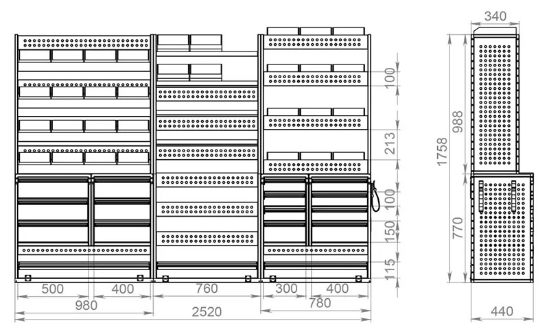 Комплект ЗМК 6.47.1758.2500.440 предназначен для комплексного оснащения сервисных автомобилей системой хранения инструмента с целью осуществления выездного сервиса, монтажа или ремонта. Используется в организациях, занимающихся ремонтом сельскохозяйственной и погрузочной техники, дорожно-ремонтных служб и других. Все элементы стеллажей изготовлены из высококачественной стали толщиной 1 мм. Рамы из профильной стальной трубы квадратного сечения 20х20 мм имеют порошковое полимерное покрытие синего цвета. Все выдвижные ящики, дверные блоки и откидные крышки оснащены специальными фиксаторами, которые не позволяют им выдвигаться и открываться при движении автомобиля. Шаг отверстий для крепления составляет 52 мм. Перфорированные стенки стеллажа позволяют фиксировать с помощью резиновых креплений вспомогательный инструмент или оборудование. Допустимая нагрузка на все ящики до 35 кг, на все полки до 50 кг, на столешницы до 100 кг. В комплект стеллажа входят все необходимые метизы, фиксаторы, кронштейны и усилители. Они поставляются в разобранном виде в надежной упаковке.