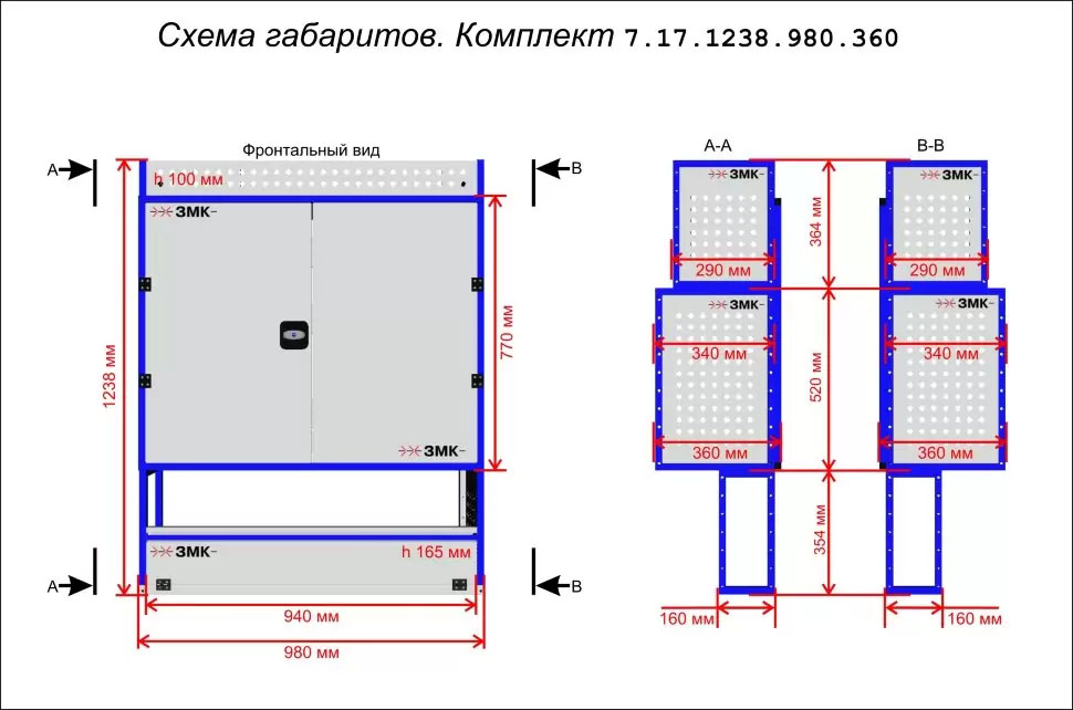 Комплект ЗМК 7.17.1238.980.360 предназначен для комплексного оснащения сервисных автомобилей системой хранения инструмента с целью осуществления выездного сервиса, монтажа или ремонта. Используется в организациях, занимающихся ремонтом сельскохозяйственной и погрузочной техники, дорожно-ремонтных служб и других. Все элементы стеллажей изготовлены из высококачественной стали толщиной 1 мм. Рамы из профильной стальной трубы квадратного сечения 20х20 мм имеют порошковое полимерное покрытие синего цвета. Все выдвижные ящики, дверные блоки и откидные крышки оснащены специальными фиксаторами, которые не позволяют им выдвигаться и открываться при движении автомобиля. Шаг отверстий для крепления составляет 52 мм. Перфорированные стенки стеллажа позволяют фиксировать с помощью резиновых креплений вспомогательный инструмент или оборудование. Допустимая нагрузка на все ящики до 35 кг, на все полки до 50 кг, на столешницы до 100 кг. В комплект стеллажа входят все необходимые метизы, фиксаторы, кронштейны и усилители. Они поставляются в разобранном виде в надежной упаковке.