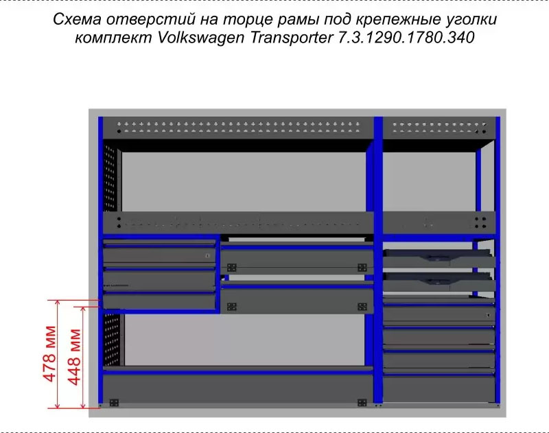 Комплект ЗМК 7.3.1290.1780.340 предназначен для комплексного оснащения сервисных автомобилей системой хранения инструмента с целью осуществления выездного сервиса, монтажа или ремонта. Используется в организациях, занимающихся ремонтом сельскохозяйственной и погрузочной техники, дорожно-ремонтных служб и других. Все элементы стеллажей изготовлены из высококачественной стали толщиной 1 мм. Рамы из профильной стальной трубы квадратного сечения 20х20 мм имеют порошковое полимерное покрытие синего цвета. Все выдвижные ящики, дверные блоки и откидные крышки оснащены специальными фиксаторами, которые не позволяют им выдвигаться и открываться при движении автомобиля. Шаг отверстий для крепления составляет 52 мм. Перфорированные стенки стеллажа позволяют фиксировать с помощью резиновых креплений вспомогательный инструмент или оборудование. Допустимая нагрузка на все ящики до 35 кг, на все полки до 50 кг, на столешницы до 100 кг. В комплект стеллажа входят все необходимые метизы, фиксаторы, кронштейны и усилители. Они поставляются в разобранном виде в надежной упаковке.
