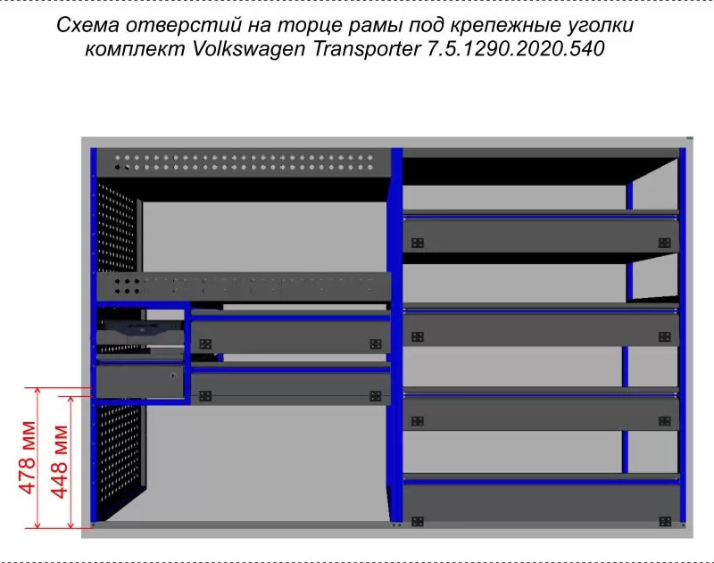 Комплект ЗМК 7.5.1290.2020.540 предназначен для комплексного оснащения сервисных автомобилей системой хранения инструмента с целью осуществления выездного сервиса, монтажа или ремонта. Используется в организациях, занимающихся ремонтом сельскохозяйственной и погрузочной техники, дорожно-ремонтных служб и других. Все элементы стеллажей изготовлены из высококачественной стали толщиной 1 мм. Рамы из профильной стальной трубы квадратного сечения 20х20 мм имеют порошковое полимерное покрытие синего цвета. Все выдвижные ящики, дверные блоки и откидные крышки оснащены специальными фиксаторами, которые не позволяют им выдвигаться и открываться при движении автомобиля. Шаг отверстий для крепления составляет 52 мм. Перфорированные стенки стеллажа позволяют фиксировать с помощью резиновых креплений вспомогательный инструмент или оборудование. Допустимая нагрузка на все ящики до 35 кг, на все полки до 50 кг, на столешницы до 100 кг. В комплект стеллажа входят все необходимые метизы, фиксаторы, кронштейны и усилители. Они поставляются в разобранном виде в надежной упаковке.