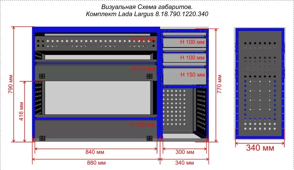 Комплект ЗМК 8.18.790.1220.340 предназначен для комплексного оснащения сервисных автомобилей системой хранения инструмента с целью осуществления выездного сервиса, монтажа или ремонта. Используется в организациях, занимающихся ремонтом сельскохозяйственной и погрузочной техники, дорожно-ремонтных служб и других. Все элементы стеллажей изготовлены из высококачественной стали толщиной 1 мм. Рамы из профильной стальной трубы квадратного сечения 20х20 мм имеют порошковое полимерное покрытие синего цвета. Все выдвижные ящики, дверные блоки и откидные крышки оснащены специальными фиксаторами, которые не позволяют им выдвигаться и открываться при движении автомобиля. Шаг отверстий для крепления составляет 52 мм. Перфорированные стенки стеллажа позволяют фиксировать с помощью резиновых креплений вспомогательный инструмент или оборудование. Допустимая нагрузка на все ящики до 35 кг, на все полки до 50 кг, на столешницы до 100 кг. В комплект стеллажа входят все необходимые метизы, фиксаторы, кронштейны и усилители. Они поставляются в разобранном виде в надежной упаковке.