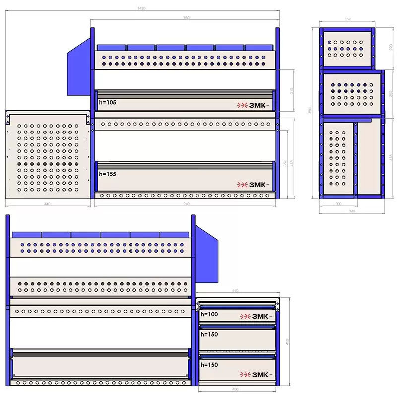 Комплект ЗМК 8.35.886.1420.340 предназначен для комплексного оснащения сервисных автомобилей системой хранения инструмента с целью осуществления выездного сервиса, монтажа или ремонта. Используется в организациях, занимающихся ремонтом сельскохозяйственной и погрузочной техники, дорожно-ремонтных служб и других. Все элементы стеллажей изготовлены из высококачественной стали толщиной 1 мм. Рамы из профильной стальной трубы квадратного сечения 20х20 мм имеют порошковое полимерное покрытие синего цвета. Все выдвижные ящики, дверные блоки и откидные крышки оснащены специальными фиксаторами, которые не позволяют им выдвигаться и открываться при движении автомобиля. Шаг отверстий для крепления составляет 52 мм. Перфорированные стенки стеллажа позволяют фиксировать с помощью резиновых креплений вспомогательный инструмент или оборудование. Допустимая нагрузка на все ящики до 35 кг, на все полки до 50 кг, на столешницы до 100 кг. В комплект стеллажа входят все необходимые метизы, фиксаторы, кронштейны и усилители. Они поставляются в разобранном виде в надежной упаковке.