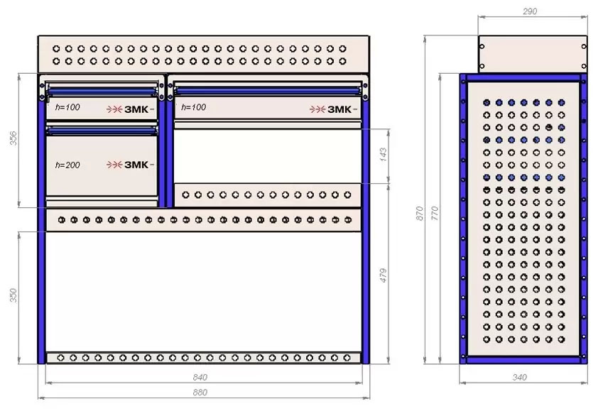 Комплект ЗМК 8.4.870.880.340 предназначен для комплексного оснащения сервисных автомобилей системой хранения инструмента с целью осуществления выездного сервиса, монтажа или ремонта. Используется в организациях, занимающихся ремонтом сельскохозяйственной и погрузочной техники, дорожно-ремонтных служб и других. Все элементы стеллажей изготовлены из высококачественной стали толщиной 1 мм. Рамы из профильной стальной трубы квадратного сечения 20х20 мм имеют порошковое полимерное покрытие синего цвета. Все выдвижные ящики, дверные блоки и откидные крышки оснащены специальными фиксаторами, которые не позволяют им выдвигаться и открываться при движении автомобиля. Шаг отверстий для крепления составляет 52 мм. Перфорированные стенки стеллажа позволяют фиксировать с помощью резиновых креплений вспомогательный инструмент или оборудование. Допустимая нагрузка на все ящики до 35 кг, на все полки до 50 кг, на столешницы до 100 кг. В комплект стеллажа входят все необходимые метизы, фиксаторы, кронштейны и усилители. Они поставляются в разобранном виде в надежной упаковке.