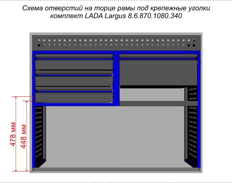 Комплект ЗМК 8.6.870.1080.340 предназначен для комплексного оснащения сервисных автомобилей системой хранения инструмента с целью осуществления выездного сервиса, монтажа или ремонта. Используется в организациях, занимающихся ремонтом сельскохозяйственной и погрузочной техники, дорожно-ремонтных служб и других. Все элементы стеллажей изготовлены из высококачественной стали толщиной 1 мм. Рамы из профильной стальной трубы квадратного сечения 20х20 мм имеют порошковое полимерное покрытие синего цвета. Все выдвижные ящики, дверные блоки и откидные крышки оснащены специальными фиксаторами, которые не позволяют им выдвигаться и открываться при движении автомобиля. Шаг отверстий для крепления составляет 52 мм. Перфорированные стенки стеллажа позволяют фиксировать с помощью резиновых креплений вспомогательный инструмент или оборудование. Допустимая нагрузка на все ящики до 35 кг, на все полки до 50 кг, на столешницы до 100 кг. В комплект стеллажа входят все необходимые метизы, фиксаторы, кронштейны и усилители. Они поставляются в разобранном виде в надежной упаковке.