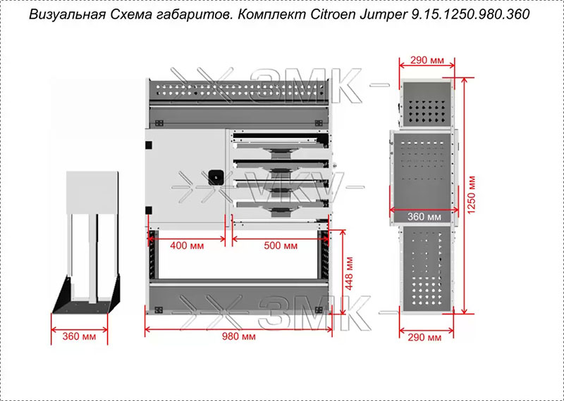 Комплект ЗМК 9.15.1250.980.360 предназначен для комплексного оснащения сервисных автомобилей системой хранения инструмента с целью осуществления выездного сервиса, монтажа или ремонта. Используется в организациях, занимающихся ремонтом сельскохозяйственной и погрузочной техники, дорожно-ремонтных служб и других. Все элементы стеллажей изготовлены из высококачественной стали толщиной 1 мм. Рамы из профильной стальной трубы квадратного сечения 20х20 мм имеют порошковое полимерное покрытие синего цвета. Все выдвижные ящики, дверные блоки и откидные крышки оснащены специальными фиксаторами, которые не позволяют им выдвигаться и открываться при движении автомобиля. Шаг отверстий для крепления составляет 52 мм. Перфорированные стенки стеллажа позволяют фиксировать с помощью резиновых креплений вспомогательный инструмент или оборудование. Допустимая нагрузка на все ящики до 35 кг, на все полки до 50 кг, на столешницы до 100 кг. В комплект стеллажа входят все необходимые метизы, фиксаторы, кронштейны и усилители. Они поставляются в разобранном виде в надежной упаковке.