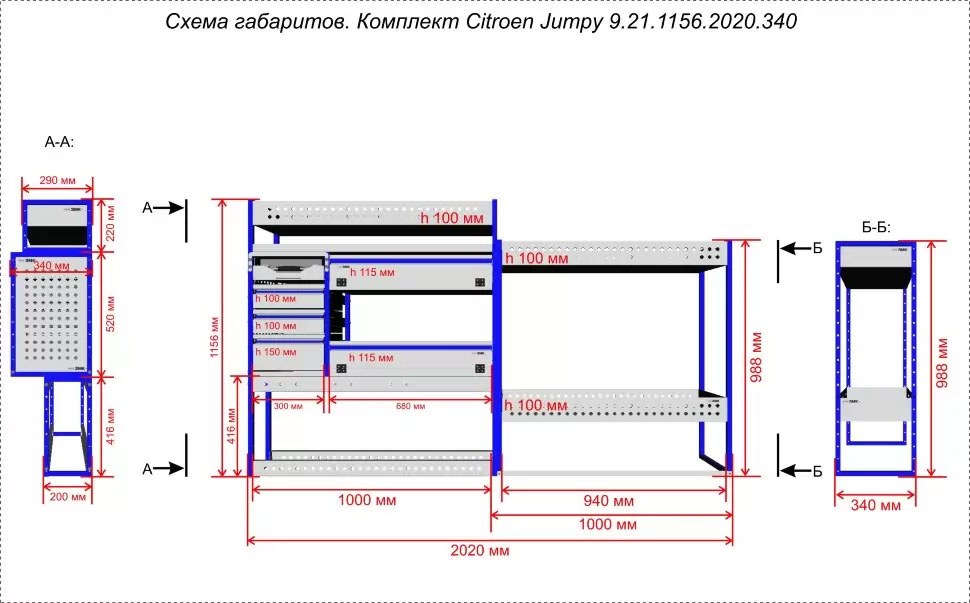 Комплект ЗМК 9.21.1156.2020.340 предназначен для комплексного оснащения сервисных автомобилей системой хранения инструмента с целью осуществления выездного сервиса, монтажа или ремонта. Используется в организациях, занимающихся ремонтом сельскохозяйственной и погрузочной техники, дорожно-ремонтных служб и других. Все элементы стеллажей изготовлены из высококачественной стали толщиной 1 мм. Рамы из профильной стальной трубы квадратного сечения 20х20 мм имеют порошковое полимерное покрытие синего цвета. Все выдвижные ящики, дверные блоки и откидные крышки оснащены специальными фиксаторами, которые не позволяют им выдвигаться и открываться при движении автомобиля. Шаг отверстий для крепления составляет 52 мм. Перфорированные стенки стеллажа позволяют фиксировать с помощью резиновых креплений вспомогательный инструмент или оборудование. Допустимая нагрузка на все ящики до 35 кг, на все полки до 50 кг, на столешницы до 100 кг. В комплект стеллажа входят все необходимые метизы, фиксаторы, кронштейны и усилители. Они поставляются в разобранном виде в надежной упаковке.