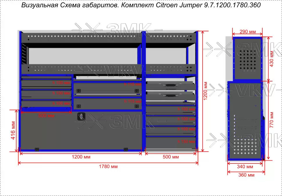 Комплект ЗМК 9.7.1200.1780.360 предназначен для комплексного оснащения сервисных автомобилей системой хранения инструмента с целью осуществления выездного сервиса, монтажа или ремонта. Используется в организациях, занимающихся ремонтом сельскохозяйственной и погрузочной техники, дорожно-ремонтных служб и других. Все элементы стеллажей изготовлены из высококачественной стали толщиной 1 мм. Рамы из профильной стальной трубы квадратного сечения 20х20 мм имеют порошковое полимерное покрытие синего цвета. Все выдвижные ящики, дверные блоки и откидные крышки оснащены специальными фиксаторами, которые не позволяют им выдвигаться и открываться при движении автомобиля. Шаг отверстий для крепления составляет 52 мм. Перфорированные стенки стеллажа позволяют фиксировать с помощью резиновых креплений вспомогательный инструмент или оборудование. Допустимая нагрузка на все ящики до 35 кг, на все полки до 50 кг, на столешницы до 100 кг. В комплект стеллажа входят все необходимые метизы, фиксаторы, кронштейны и усилители. Они поставляются в разобранном виде в надежной упаковке.