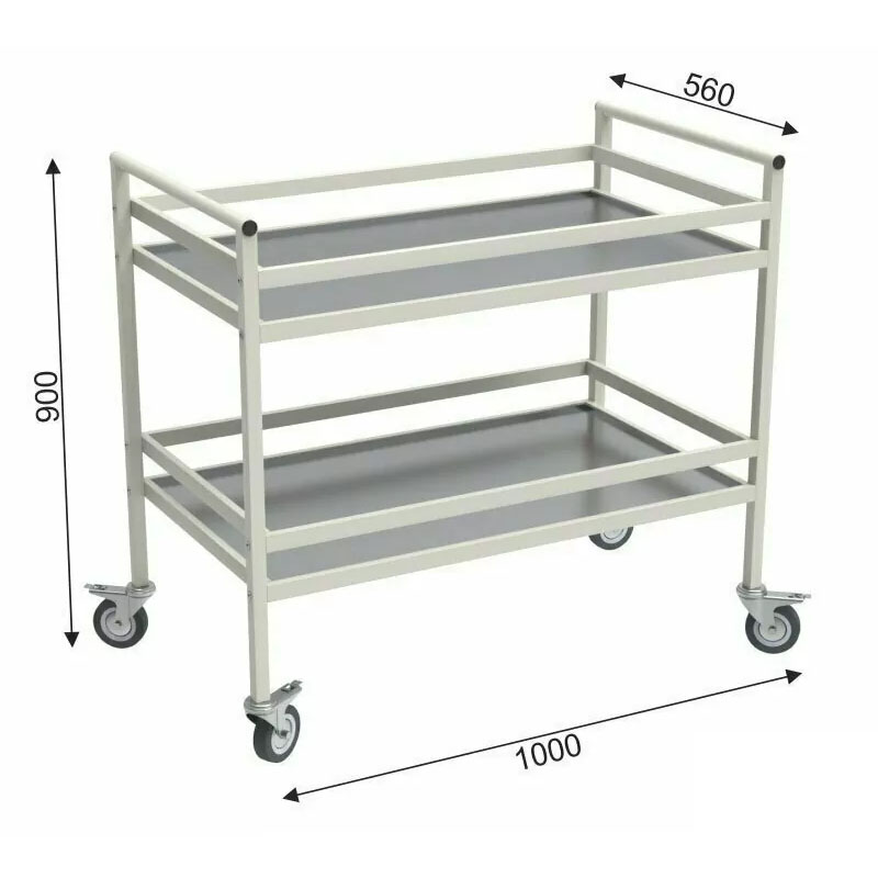 Изготовлена из стального профиля с полимерно-порошковым покрытием. Устойчива к санитарно-дезинфекционной обработке. Тележка имеет 2 полки из стального листа с ограждениями с четырех сторон. Все колеса тележки поворотные, серая резина не оставляет следов на полу, два колеса с тормозом. Диаметр колес 100 мм. Тележка поставляется в собранном виде.