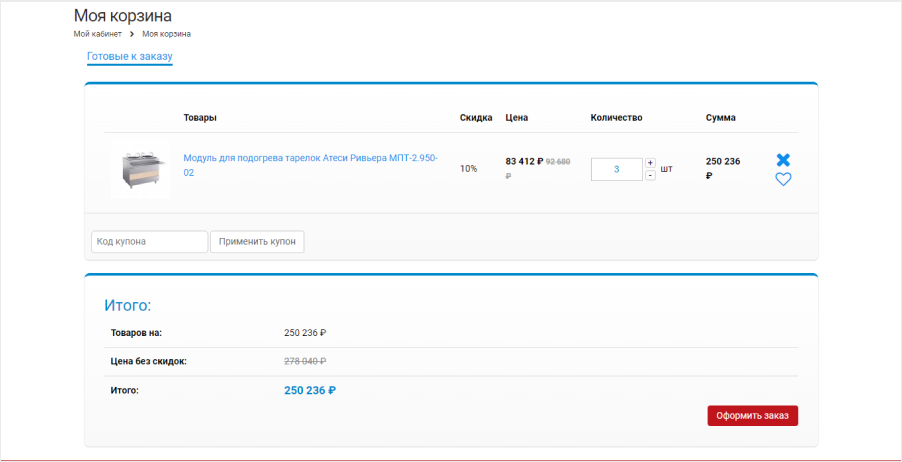 Вы попадете в раздел Корзина, здесь вы можете еще раз проверить ваш заказ Товар / Скидка / Цена / Количество / Сумма и ввести скидочный купон, если такой у вас имеется. Для продолжения оформления нажмите кнопку «Оформить заказ»