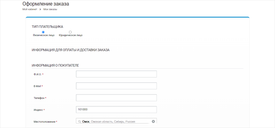 Вы попадаете в раздел оформления заказа. Выберите тип плательщика: Физическое лицо или Юридическое лицо.
