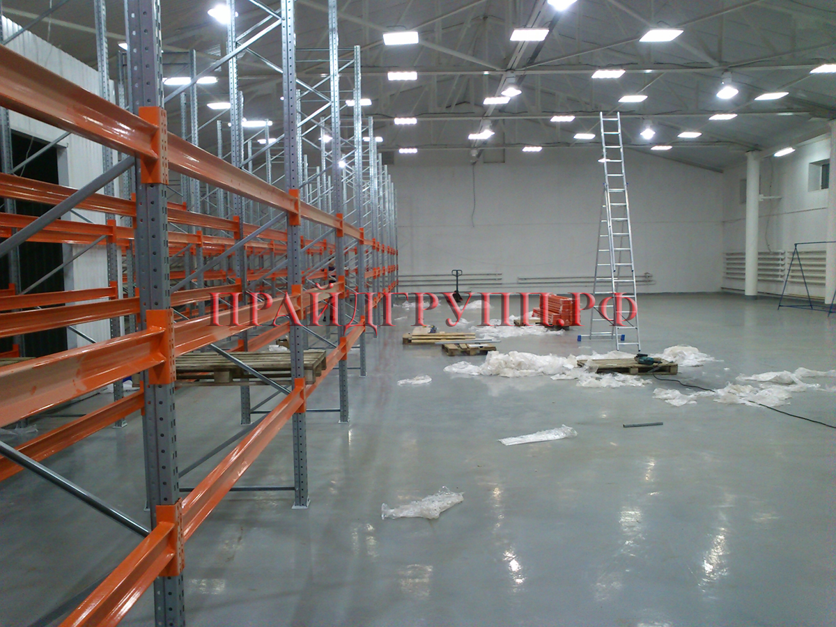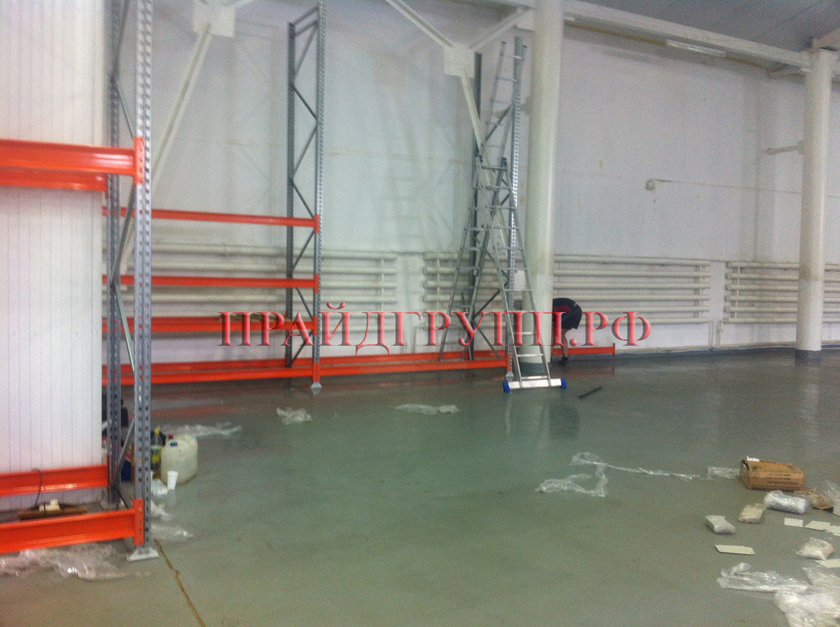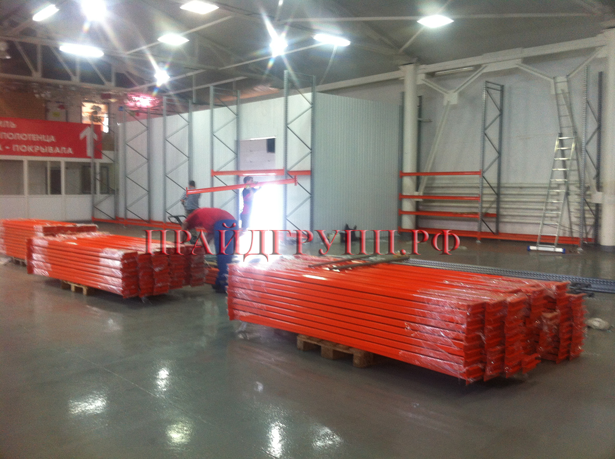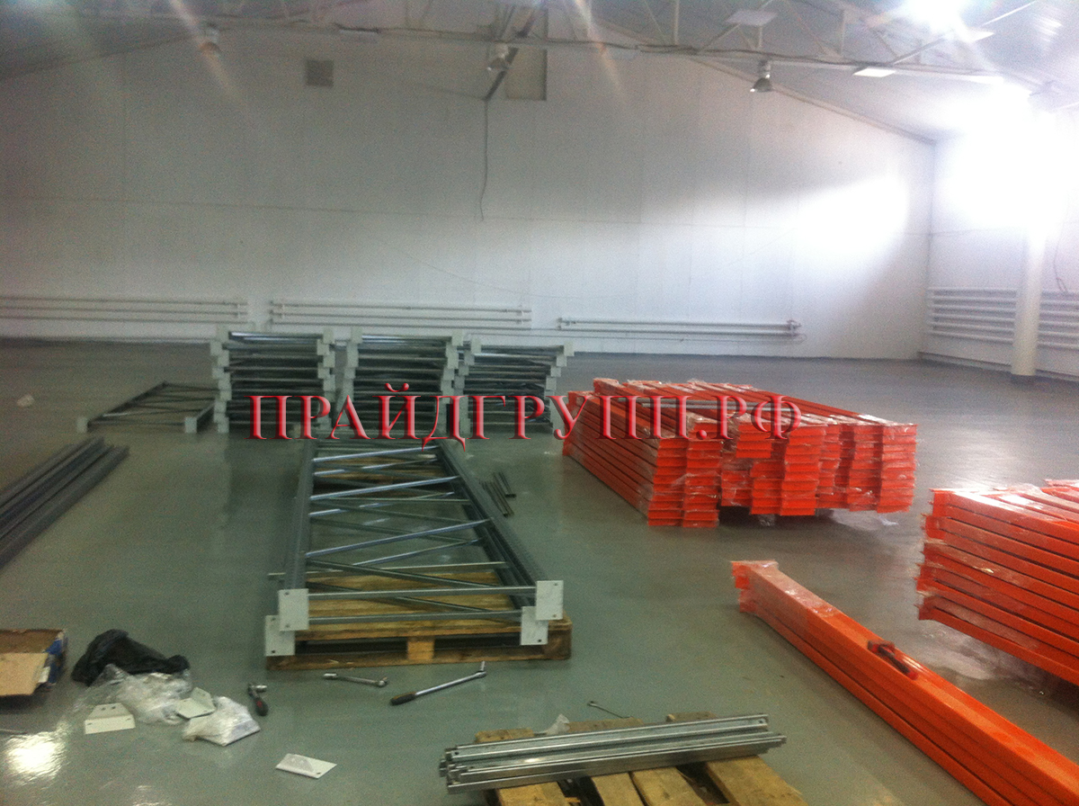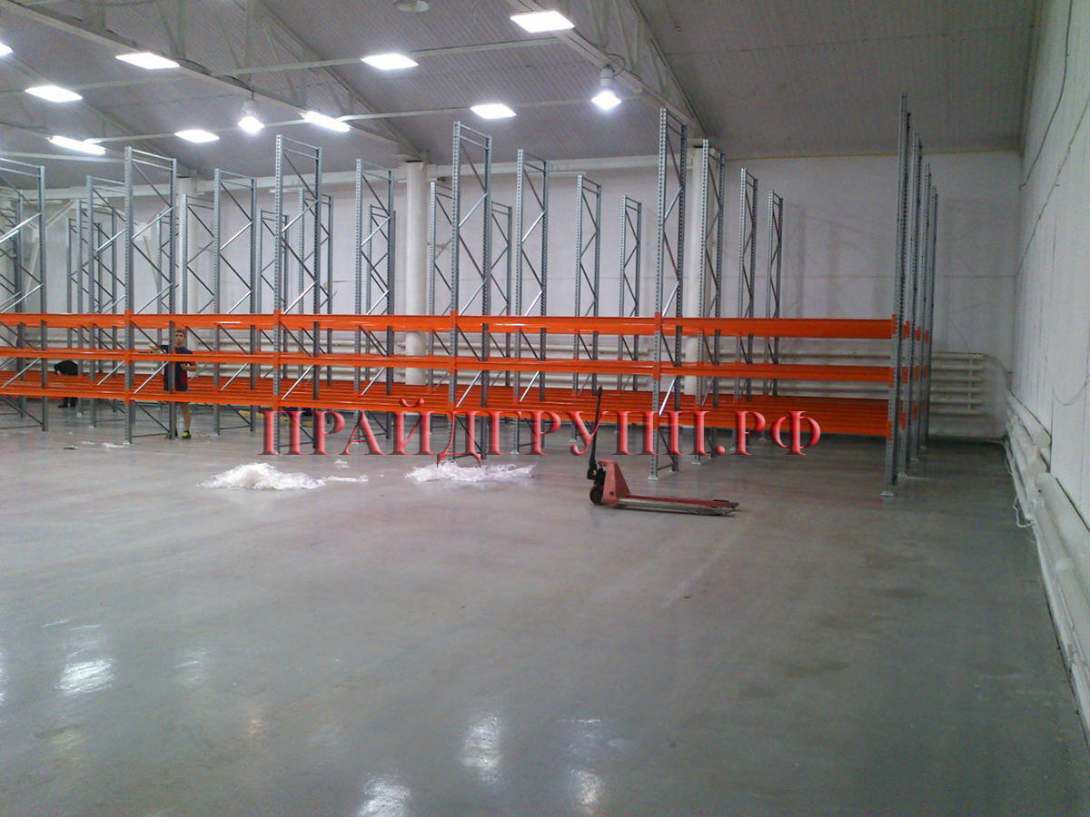 Тобольск. Застроили стеллажами часть складского помещения под спецодежду и рыбалку, площадь более 1000 кв.м. Высота стеллажей 4,5м. Нагрузка на полку 1500 кг. Представлено следующее оборудование: рамы фронтальных стеллажей, паллетные стеллажи.